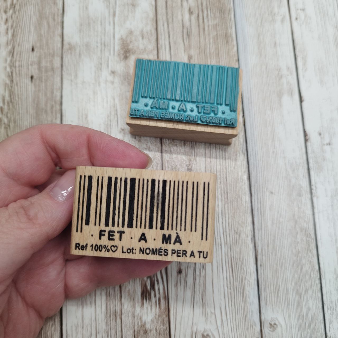 Sello de caucho con un código de barras y la frase "Fet a mà" (en catalán)